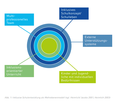 Auf der Basis eines Mehrebenenmodells inklusiver Schulentwicklung werden Qualitätsstandards beschrieben, in denen wiederum Leitfragen zur Umsetzung formuliert sind – angelehnt an den Index für Inklusion. Diese bieten Anregung für die Einbettung der Standards in den jeweiligen Schulentwicklungsprozess.