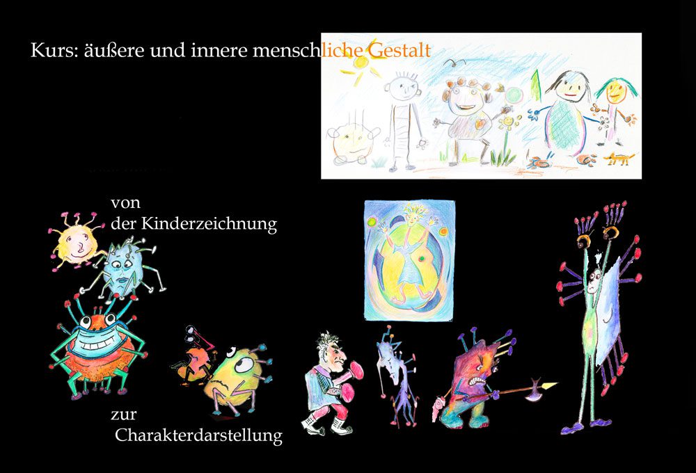 Die Fertigkeit, die menschliche Gestalt ins Bild zu setzen, ist uns nicht in die Wiege gelegt worden. Wir müssen das lernen. Wenn sich die Kinder konzentrieren können, üben sie einen Kreis zu schließen und zeichnen alsdann die sogenannten Kopffüßler. Am einfachsten ist es spielerisch auf diesem Gebiet tätig zu werden. Es ist erstaunlich, was plötzlich alles an seelischen Ausdruck entsteht. Kindheitserlebnisse so ins Bild zu fassen, scheint vielleicht etwas albern, aber eine ausgezeichnete Übung um seelische Regungen bewusst zu erfassen. (siehe Film)