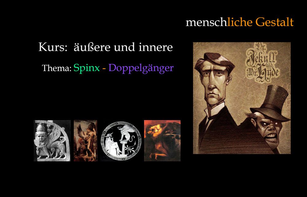 Das Phänomen der Spaltung des Ichbewusstseins in der Schizophrenie, ist ein Krankheitsbild, das sich nur schwer heilen lässt. Ein ähnliches Phänomen ist im Sinnbild der Gestalt des Doppelgängers z.B. Bei Stevensons Erzählung „Der seltsame Fall des Dr. Jekyll und Mr. Hyde“ inbegriffen. In der Mythologie ist es die Gestalt der Sphinx, die die Frage stellt, was den Menschen eigentlich ausmache. Es gibt viele Variationen die Dramatik der Selbsterkenntnis auf diese Ebene, auf der es sich als Persönlichkeit zu begreifen bzw. zu behaupten gilt.